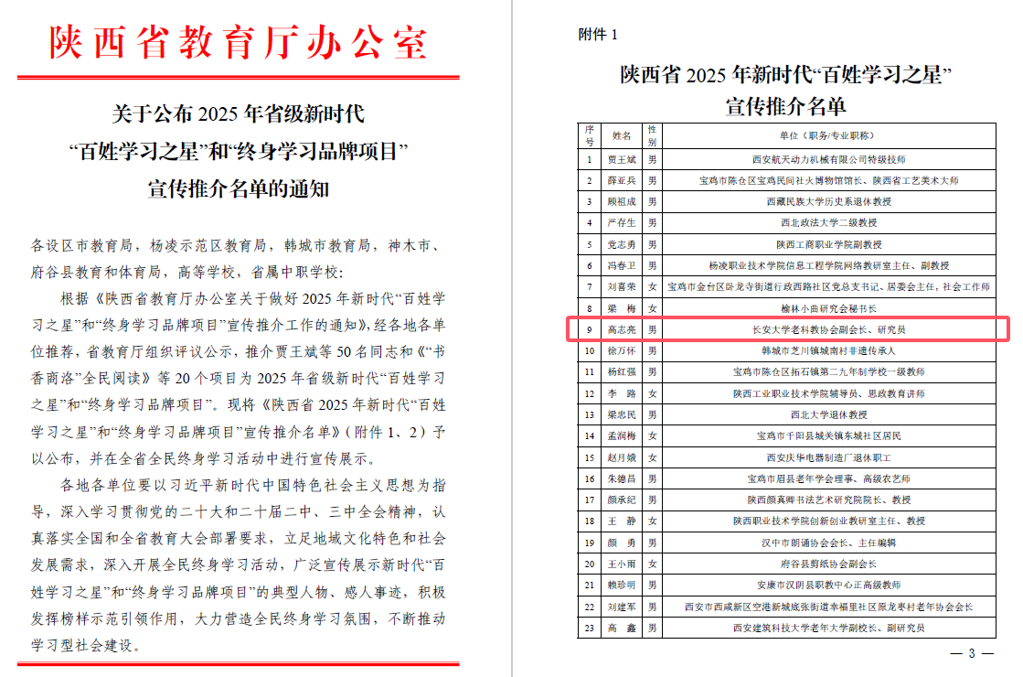 近日,陕西省教育厅办公室下发《关于公布2025年省级新时代“百姓学习之星”和“终身学习品牌项目”宣传推介名单的通知》文件,我校高志亮老师获评陕西省“百姓学习之星”称号。