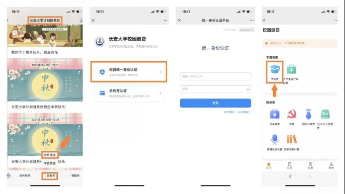 2.缴费渠道:关注“英国365集团计划财务处”公众号(chdjcc),第一步 “微缴费--缴费通道--校园统一身份认证--账号激活”在激活中设置密码;第二步“微缴费--缴费通道--校园统一身份认证--输入学号和密码--学杂费”进行缴费。
