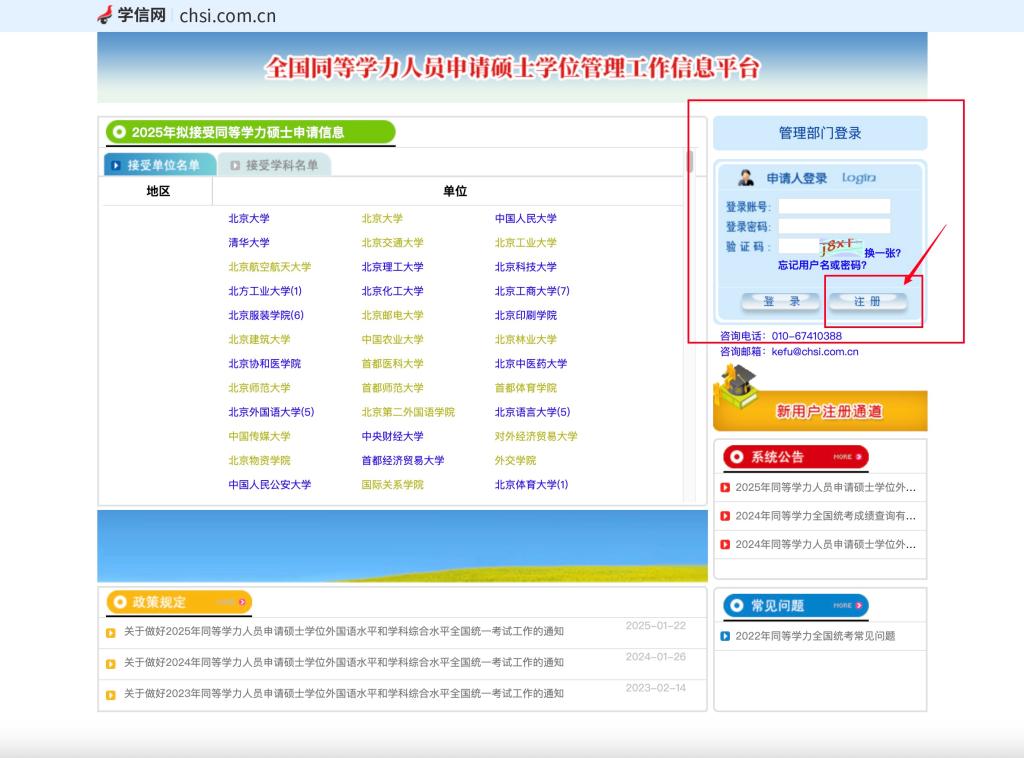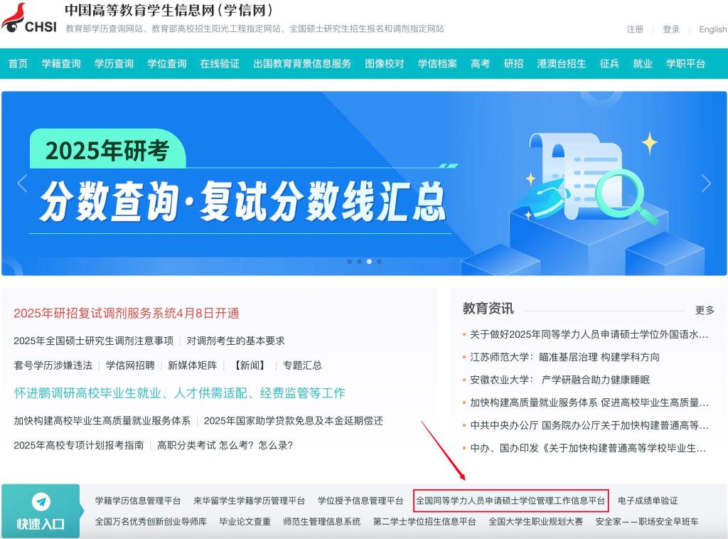 一、申请人登录学信网(https://www.chsi.com.cn/)选择“全国同等学力人员申请硕士学位管理工作信息平台”进行注册。