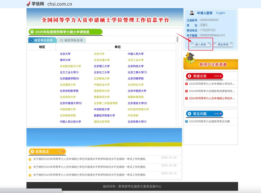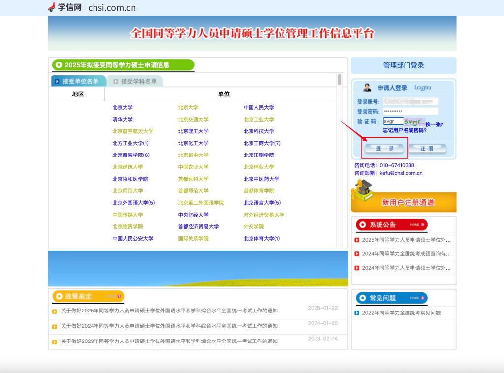 二、完成注册后,使用新注册的账户登入“全国同等学力人员申请硕士学位管理工作信息平台”,进行学位申请。