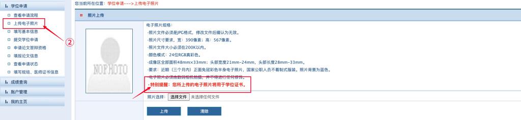 1.上传电子照片(特别提醒:上传的电子照片将用于学位证书。)